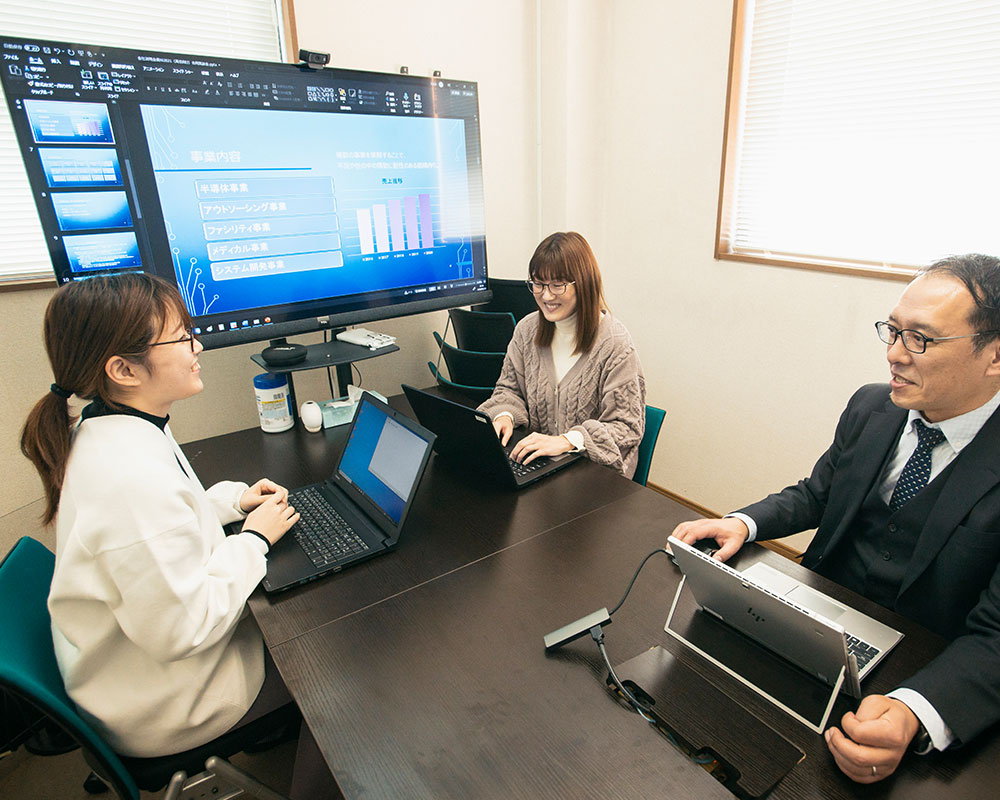1. 顧客のニーズに答えるため、メンバー一丸となってシステム開発に取り組みます。メンバー全員で力を合わせて障害を乗り越え、システムが完成した際に味わう達成感は他とは替え難いものがあります。